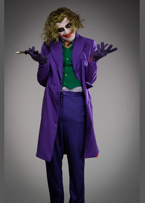 Adult mens size official Batman The Dark Knight super villain character Grand Heritage super deluxe quality The Joker fancy dress costume, includes a long purple jacket, shirt, striped trousers, green waistcoat vest, tie, purple gloves, green wig and a make-up kit.