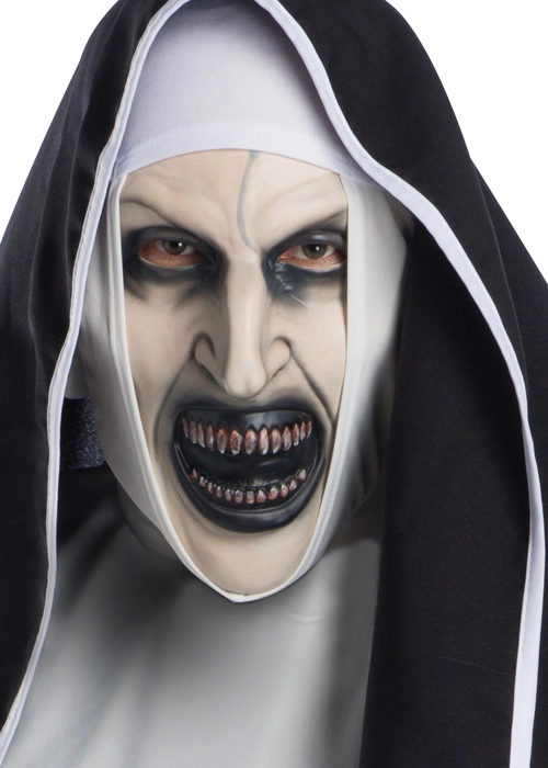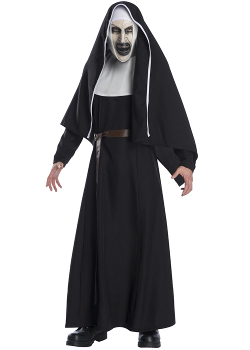 A terrifyingly good costume from The Nun horror movie, this costume includes a long black dress, white collar, brown belt, mask and headpiece.
