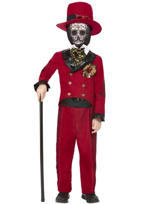 A fantastic boys outfit that is perfect for Halloween or Dia De Los Muertos, this day of the dead groom costume includes a burgundy jacket with a gold sequin sacred heart detail, mock shirt front with neck ruff, burgundy trousers, mask and a burgundy fabric hat.