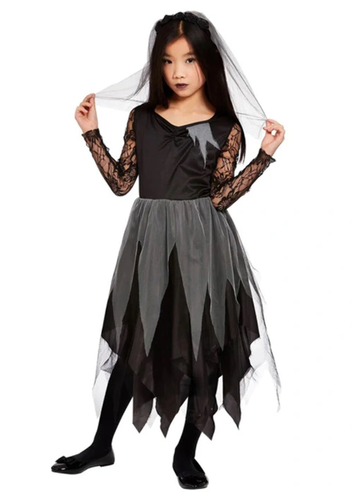 A fantastic girls Halloween costume, this gothic graveyard bride outfit includes a black and grey tattered effect bride dress with lace sleeves and a black veil headband.