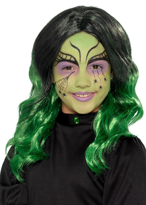 A great value accessory for a kids Halloween costume, this would would be ideal for a wicked witch outfit. This is a childs size long wavy green and black wig that comes on an elasticated net for easy wear.