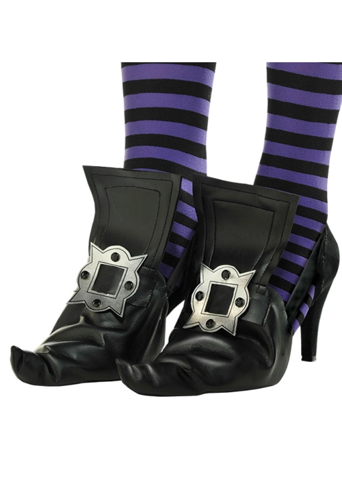 A fantastic finishing touch for a wicked witch costume. These childrens size black pointed witch shoe covers with metallic finish buckle detail. Simply fits over the top of your own black shoes. Perfect for Halloween!