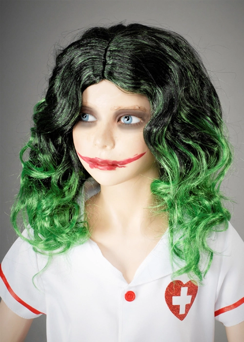 A great value accessory for a kids Joker inspired costume, this is a childs size long wavy green and black wig that comes on an elasticated net for easy wear.