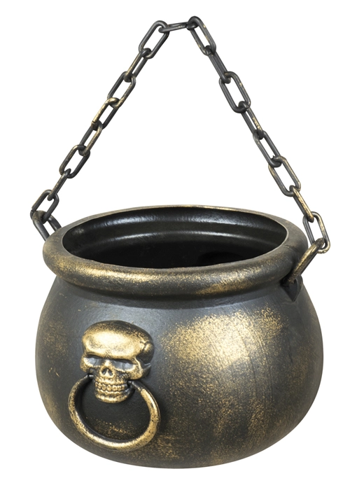 This brilliant gold coloured plastic skull witches cauldron with a plastic chain handle is perfect for Trick or Treating!