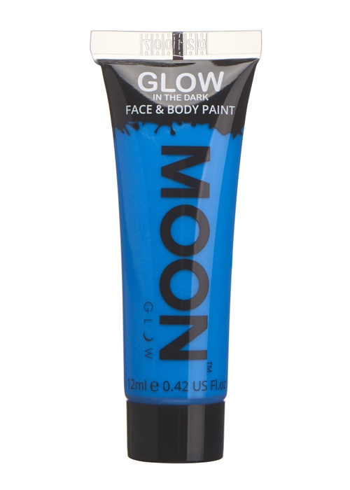Suitable for adults and children neon raver style fancy dress accessory glow in the dark make-up 12ml tube of neon blue glow body paint. Can be applied directly to clean skin and can be washed off with warm soapy water.