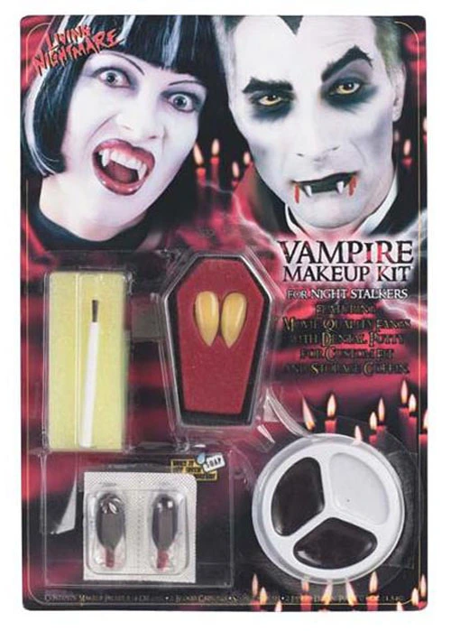 A great value vampire make-up kit! Includes vampire fang tooth caps with putty adhesive, grease based creme make-up in black and grey, liquid fake blood capsules, make-up applicator sponge and brush. Everything you need for Halloween!