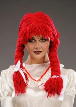 A fantastic creepy doll costume accessory inspired by Annabelle, this red rag doll woolen wig comes on an elasticated size net for easy wear. Perfect for Halloween!