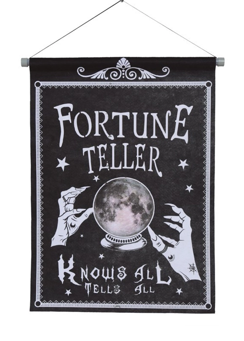 A fantastic decoration for a creepy carnival themed Halloween party, this vintage look circus Fortune Teller design fabric prop sign measures approximately 42cm by 60cm.