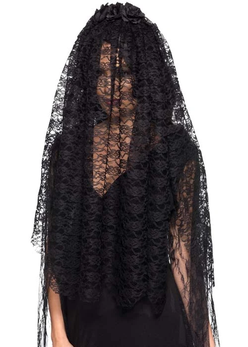 A gorgeous gothic accessory for a Halloween dead bride outfit, this long black lace fabric veil comes on a hairband with attached black fabric flowers for easy wear.