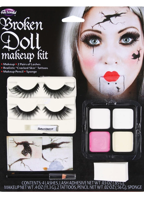 This creepy broken doll fancy dress make-up set includes two sets of black false eyelashes, eyelash adhesive, a black cracked skin effect fake tattoo, black make-up pencil, sponge and make-up colours!