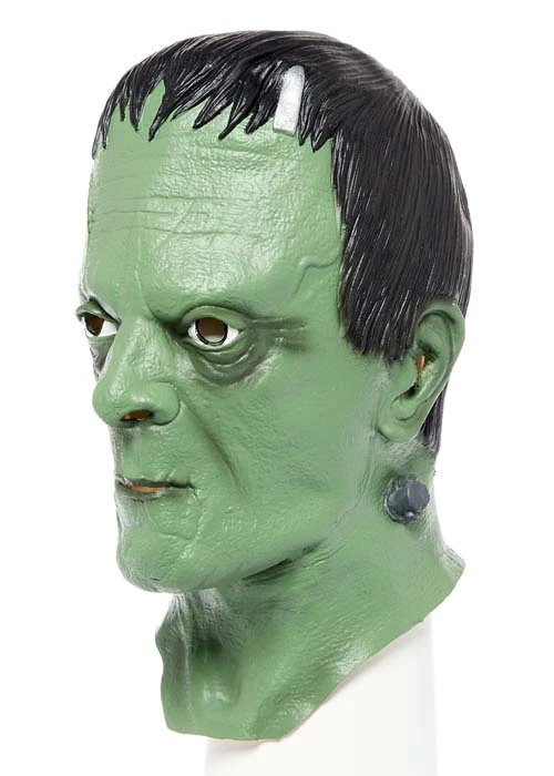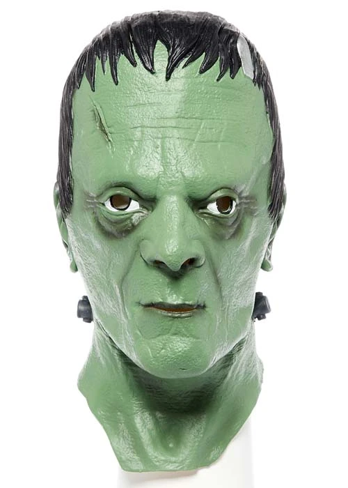 A classic Halloween horror movie character green Frankensteins monster overhead latex mask features moulded latex neck bolts, one adult size.