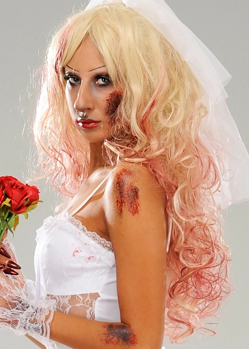 A fantastic fancy dress accessory for a dead bride Halloween costume, this luxe messy blonde zombie wig features a fringe and fake blood dipped ends ad comes on an adjustable net to fit different sizes.