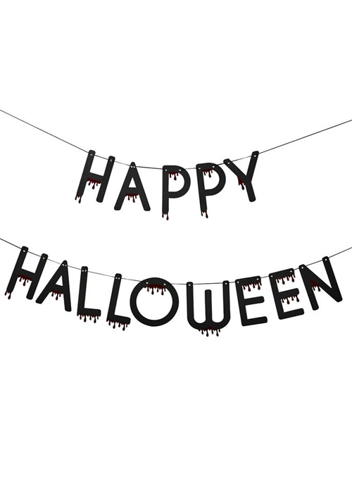 A fantastic party decoration for a Halloween party, this black ans foiled blood drip Happy Halloween design bunting banner includes two seperate strands with a total of 4 metres of black twine.