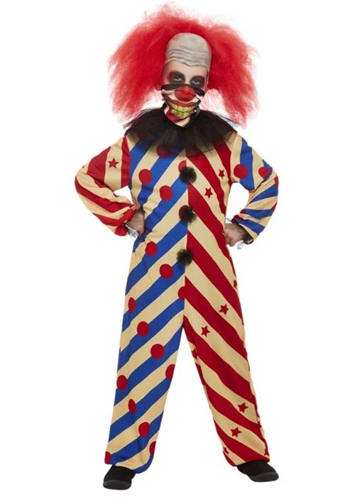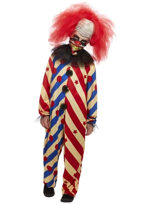 This boys creepy clown costume is perfect for Halloween, includes an all in one red and blue jumpsuit with pom poms, neck ruff collar and a matching fabric face covering mask.
