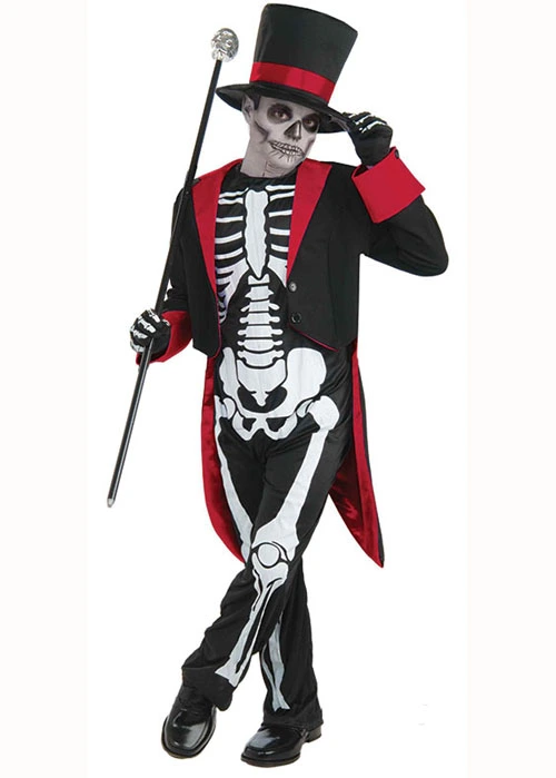 Our amazing childs size Halloween Mr Bone Jangle skeleton style costume includes a black jumpsuit with a white skeleton print, black and red tailcoat jacket and a matching red and black top hat!