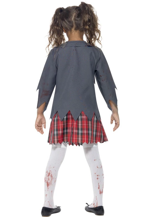This scary kids zombie schoolgirl costume is guaranteed to be a hit this Halloween! Includes a tattered tartan schoolgirl skirt, grey blazer style jacket with fake blood splatters and a mock shirt front with tie. Available in various sizes!