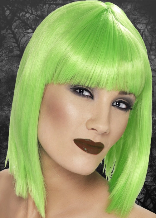 A brilliant Halloween style neon green bobbed wig with a fringe! Supplied on an elasticated net to fit different sizes.