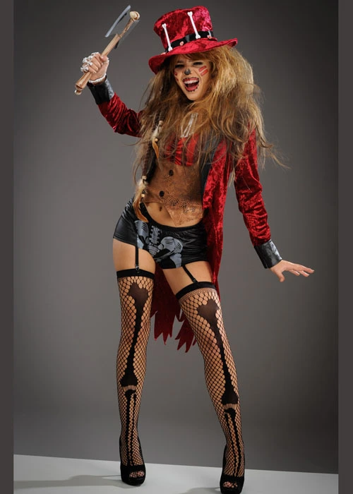 A cute voodoo outfit that is perfect for Halloween, this voodoo priestess costume includes a burgundy and black tattered tailcoat jacket, brown top, skeleton shorts, fabric top hat and necklace.