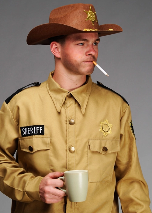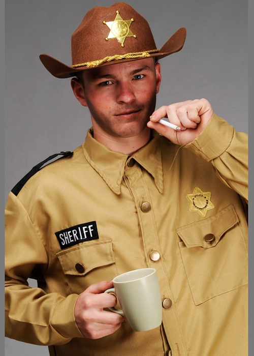 A great outfit for a Stranger Things fan, this Sheriff Hopper style costume includes a brown sheriff shirt with attached badge , brown sheriff hat and a fake joke cigarette.