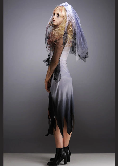 A beautiful and unique teen sized zombie bride costume! Includes a long grey and white dress with tattered effect hem and a lace net veil headpiece. Perfect for any Halloween party!