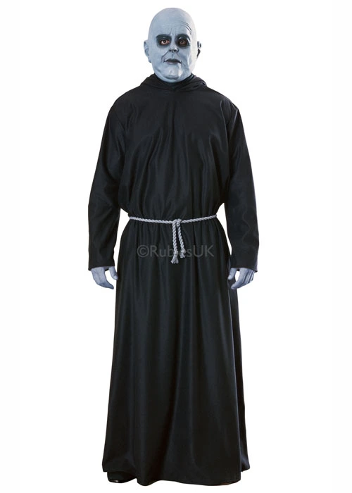 A fantastic costume for Halloween great for an Addams family fan, this Uncle Fester costume includes a long hooded robe, cord belt and mask.