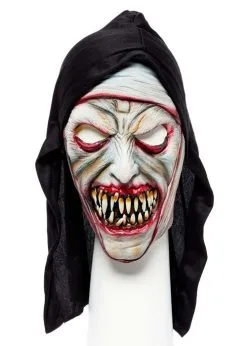 A fantastic scary accessory that is perfect for Halloween, inspired by the horror movie The Nun this latex zombie nun mask features an attached black fabric hood headpiece.