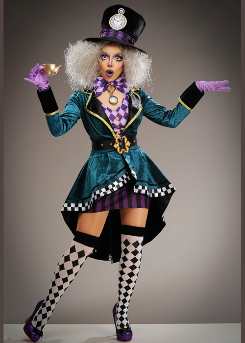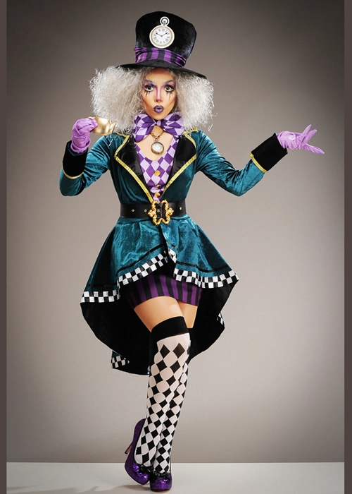 Our gothic themed Mad Hatter costume is ideal for Halloween! Includes a black and purple printed pattern tank dress, a dark green velvet mad hatter jacket with checkerboard trim, a black and gold belt, large purple bow tie and a black fabric top hat with purple trim.