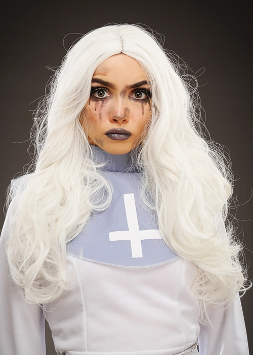 A great quality gothic wig that is perfect for crating a Halloween wicked evil nun costume, this soft haired good quality long white wavy wig comes on an adjustable size net for easy wear.