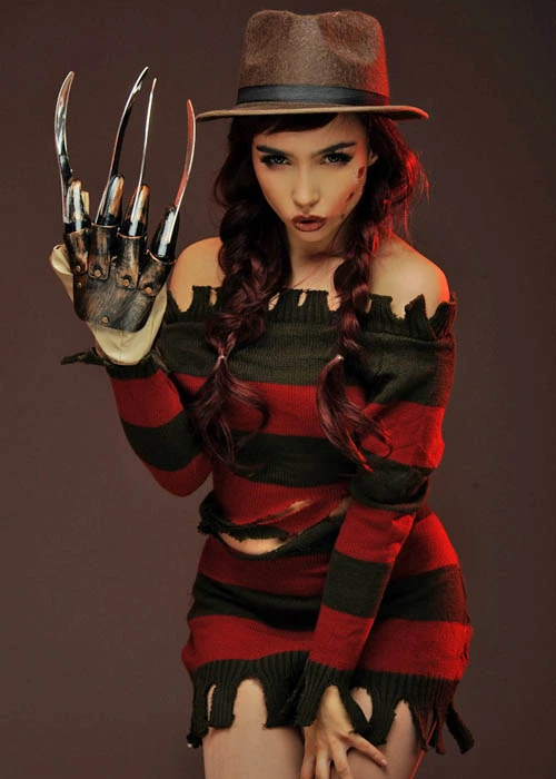 The perfect Halloween costume for horror fans! Includes a ripped front detail dress, plastic fright glove and a brown fedora style hat. Available in a variety of sizes!