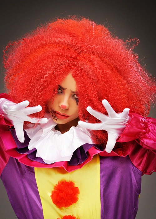 A fantastic bright red shoulder length crimped curly scary clown wig on an elasticated net, ideal for Halloween!
