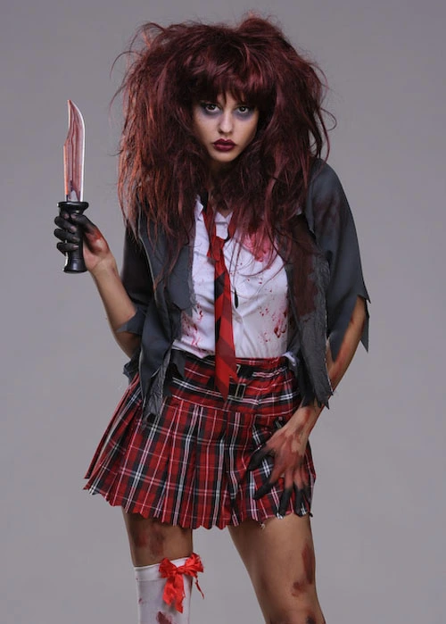 A fantastic zombie schoolgirl costume which is guaranteed to scare your friends and family! Includes grey blood splattered jacket with attached white shirt front, a ragged red and black striped tie and a tattered short length red tartan skirt.