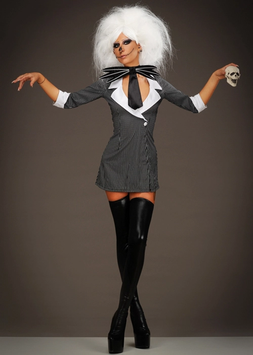 A fantastic fun Jack Skellington from A Nightmare Before Christmas inspired Halloween outfit, this gothic skeleton costume includes a black and white bone stripe pattern short dress with button and white cuff details and a large oversized fabric bow tie.