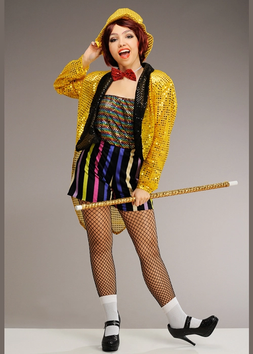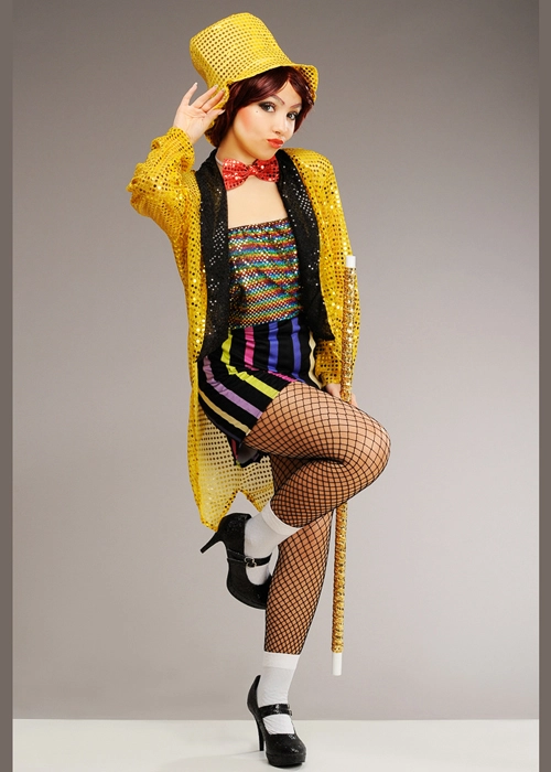 This official Rocky Horror Picture Show Columbia costume includes a gold sequin tailcoat jacket, sequin tube top, shorts, bow tie and gold fabric hat. Comes in one size to fit a UK dress size 10-12.