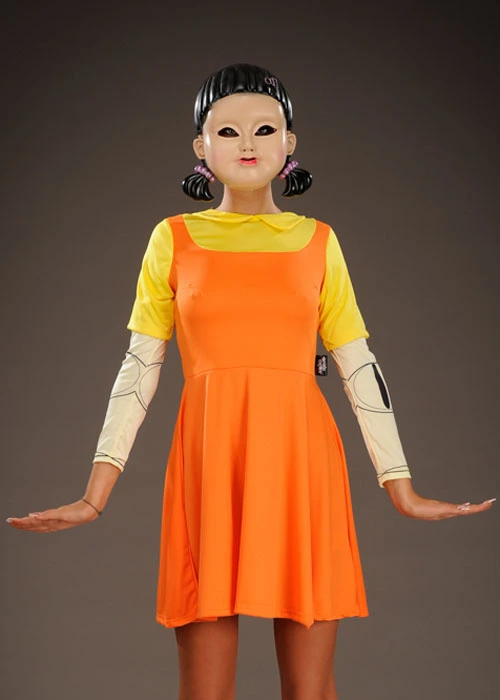 A fantastic official Squid Game fancy dress costume, this adult size deluxe doll outfit includes an orange dress with printed sleeve details, face mask and white knee socks.